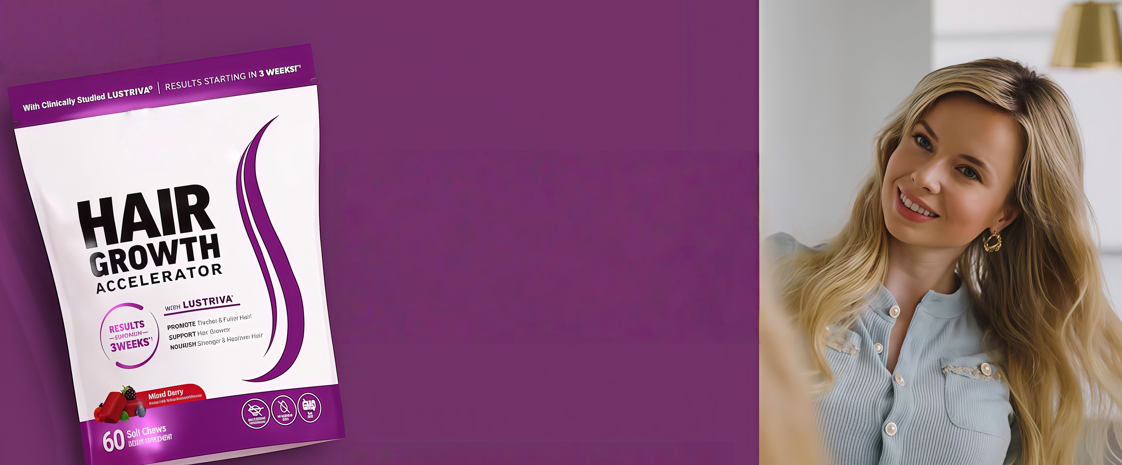 It's powered by Lustriva, a patented and scientifically superior form of biotin and silicon that's 40X more soluble than regular biotin, and clinically studied to increase hair thickness startingin 3 weeks.Delivered in delicious and convenient soft chews,elevating the way you look and feel has never been easier.